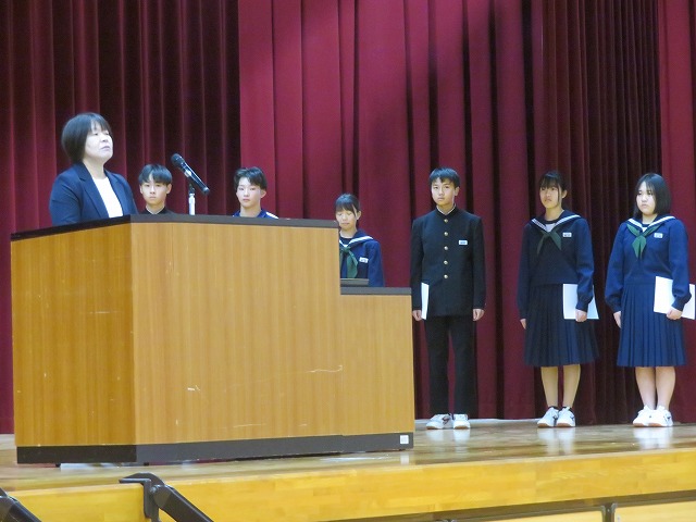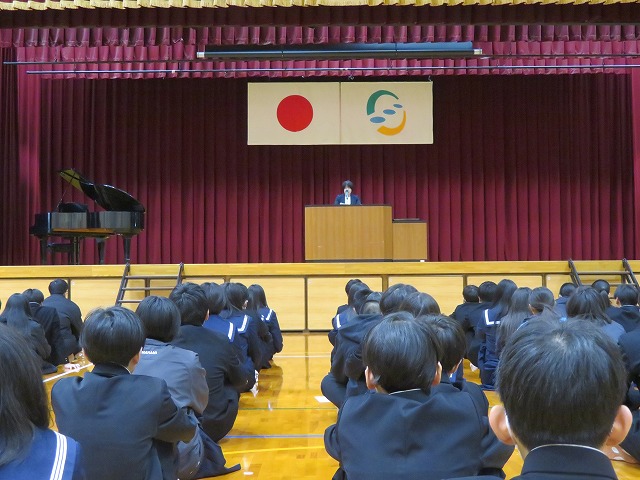 校長先生からは、「3学期はたった3か月しかありません。次のステージへの新しい扉を開けるためにも、『有言実行』決めるのも自分、やるのも自分です。時間はすべての人に平等に与えられています。『迷ったら前へ。苦しかったら前に。つらかったら前に。後悔するのはそのあと、そのずっと後でいい。(星野仙一さんの名言より)』一日一日を大切に過ごしていきましょう。」というお話がありました。