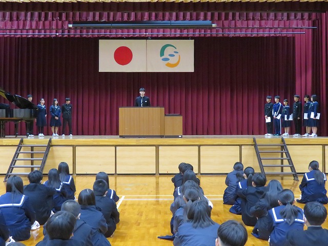 続いて、生徒会本部役員の任命式、引継式がありました。前生徒会本部役員から一人一人すばらしい挨拶がありました。その後、新生徒会から、新しい目標も発表されました。