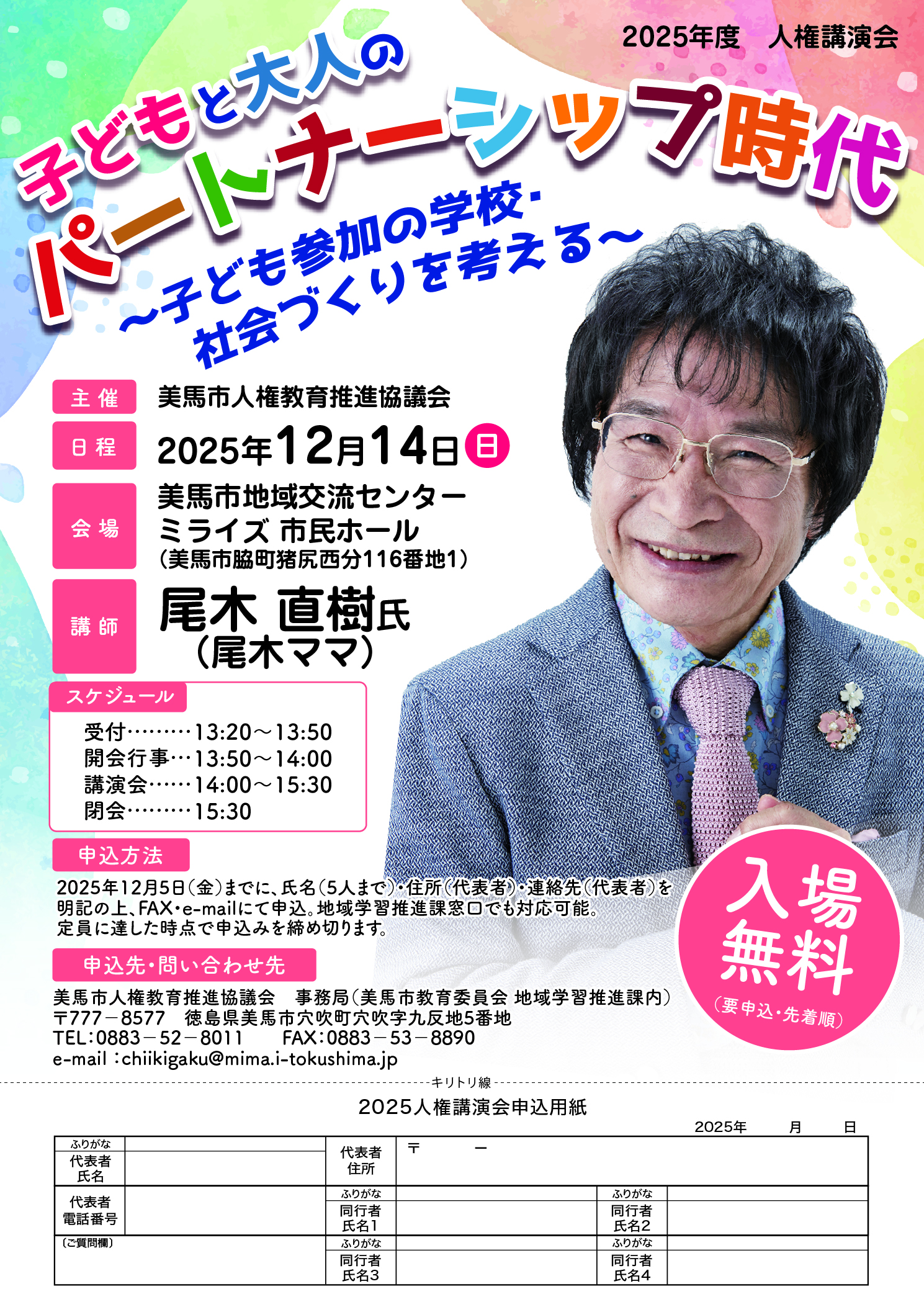 美馬市人権教育推進協議会事務局(教育委員会地域学習推進課内)(chiikigaku@mima.i-tokushima.jp)までお申し込みください。